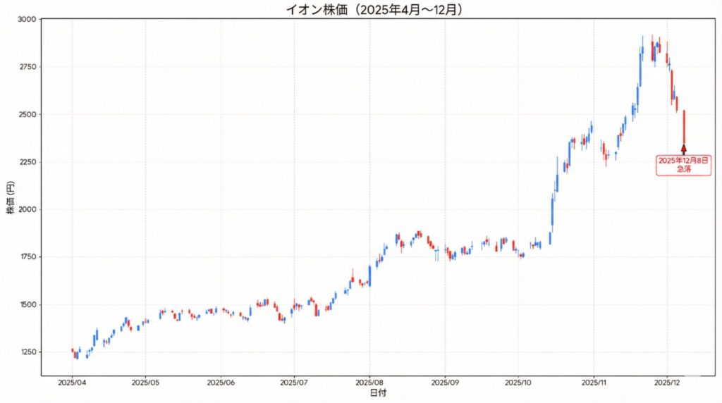 2025年12月8日、イオン(8267)の株価が一時▲7%近く急落し、「PER160倍の高値からの崩れ」「BYD提携報道で炎上」といったワードがSNSにあふれました。