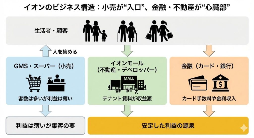 イオンを「スーパーの会社」とイメージしていると、ビジネスの本質を見誤りやすくなります。