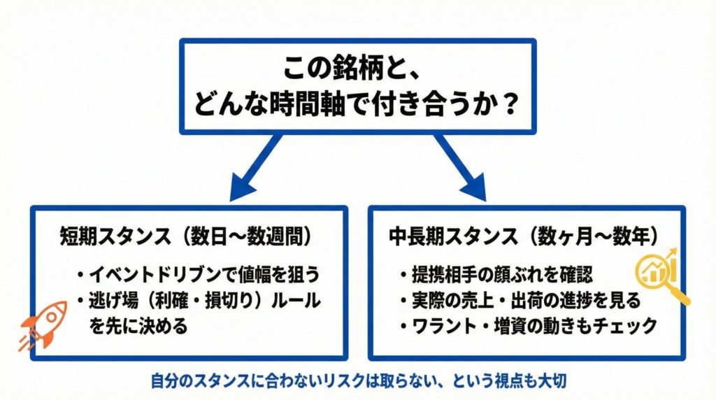 最後に、個人投資家がこの銘柄と向き合うときの、考え方のヒントを時間軸ごとに整理します。