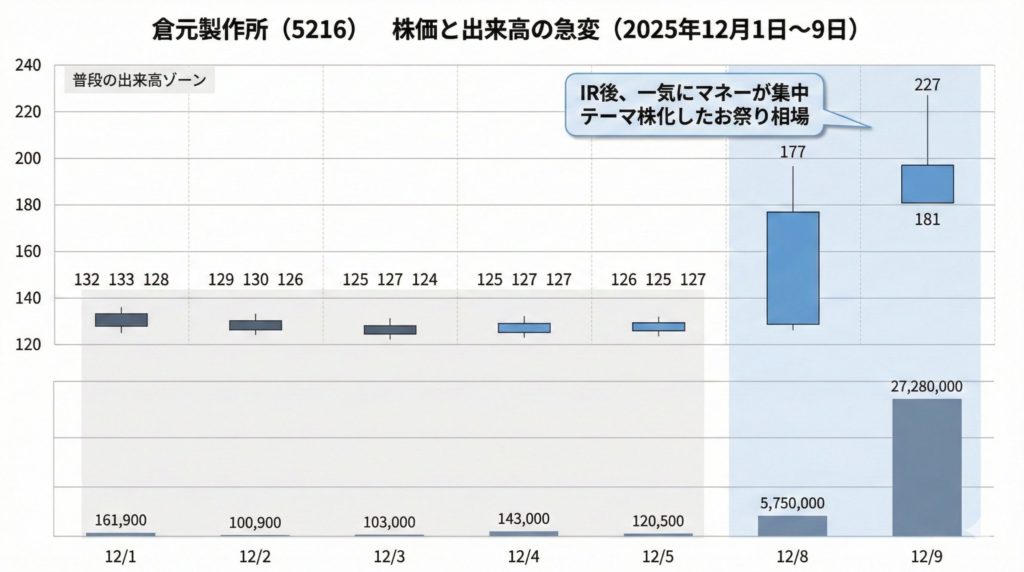 • IRをきっかけに出来高が一気に数十〜数百万株レベルへ膨張