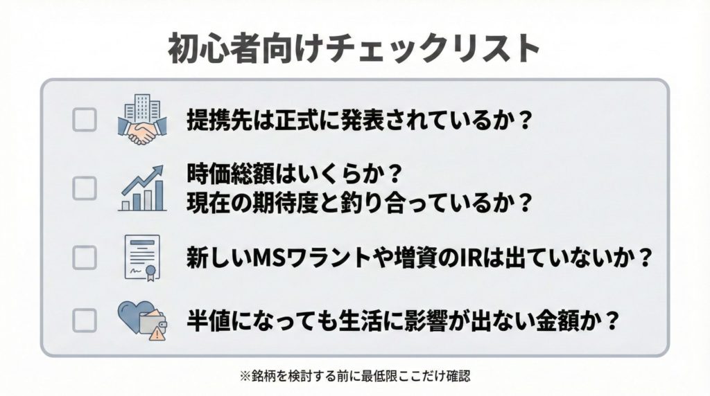 この銘柄を検討する際、最低限チェックしたい項目をチェックリスト形式でまとめます。