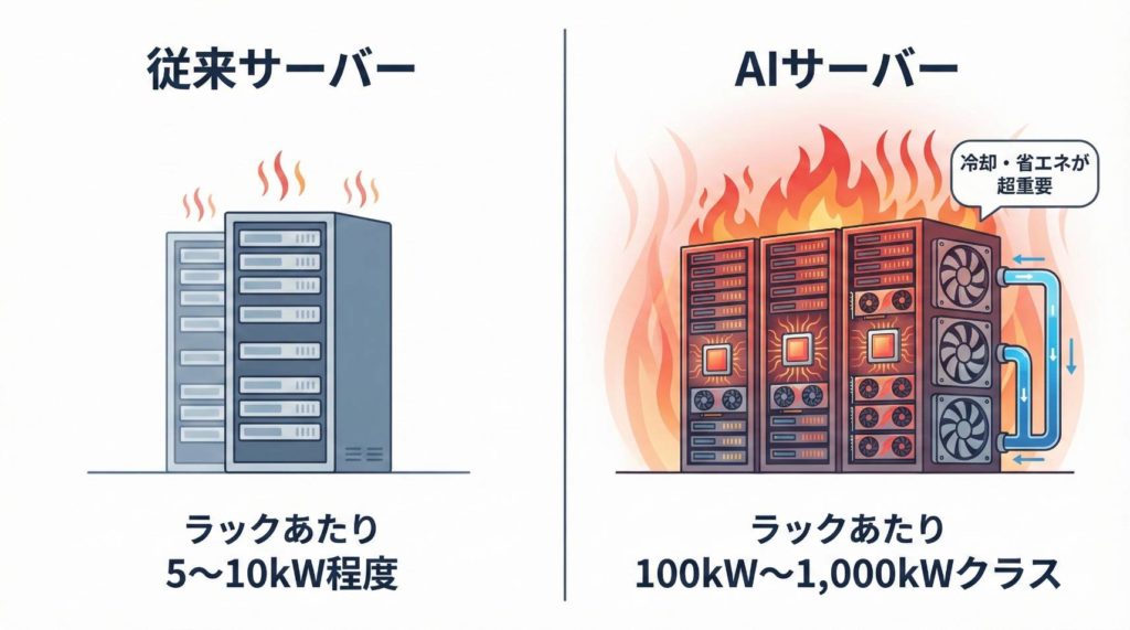 AIサーバーは、従来のサーバーに比べて電力消費と発熱が桁違いです。