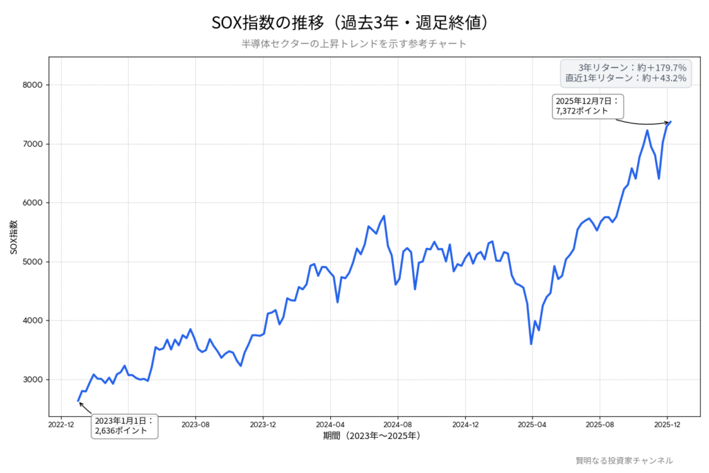 フィラデルフィア半導体株指数(SOX指数:世界の主要半導体メーカーで構成される株価指数)は7,000ポイント台後半という過去最高水準に近い位置で推移しており、1年リターンは約45%、3年では約2.8倍という非常に強いパフォーマンスになっています。
