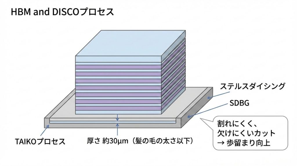 HBMのような多層積層メモリでは、ウェハーを極限まで薄くし、それを割らずに切り分ける技術が不可欠です。