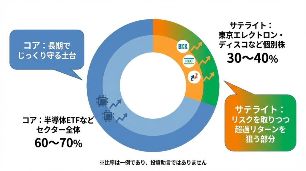 個人投資家が、「第2ラウンドの半導体相場」に付き合うのであれば、コア・サテライト戦略で考えるのが現実的だと思います。