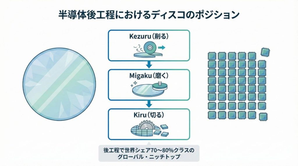 これらの分野で世界シェア70〜80%とされるグローバル・ニッチトップであり、「ディスコの装置を通らないチップはほとんど存在しない」と言われるほどの存在感を持っています。