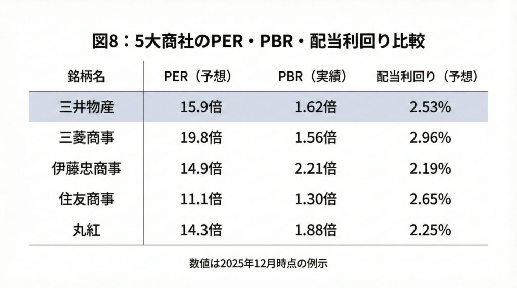 代表的な5大商社と指標を比べると、三井物産の特徴が浮かび上がります(※2025年12月11日時点)。