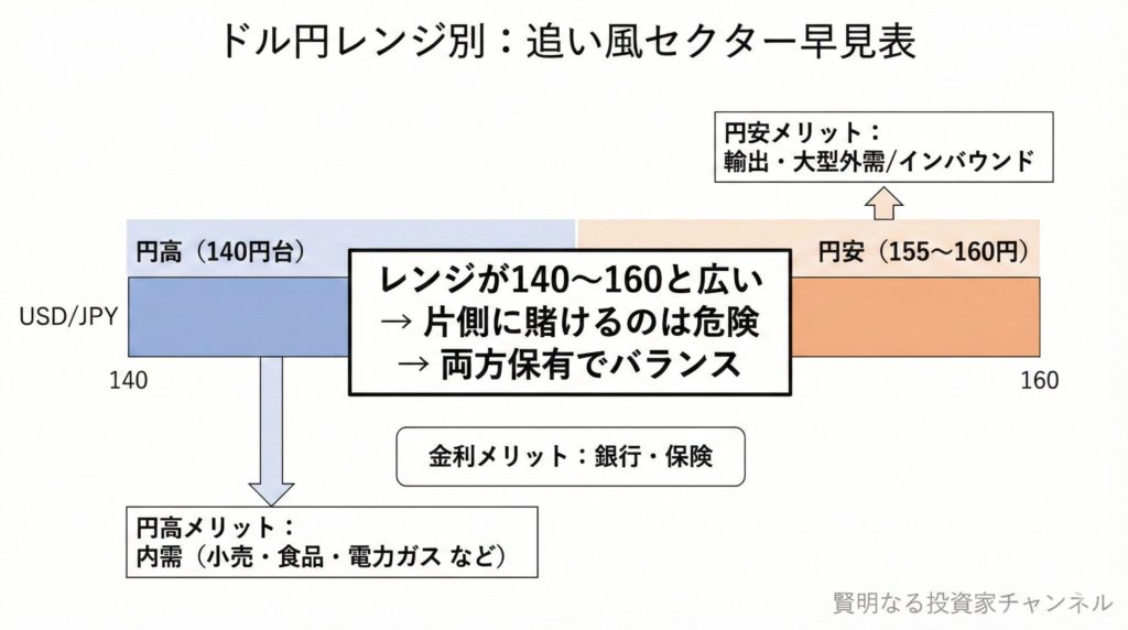 為替は2025年末に向けて見通しが割れやすく、円高(140円台)と円安(155〜160円)で恩恵を受けるセクターが大きく変わります。