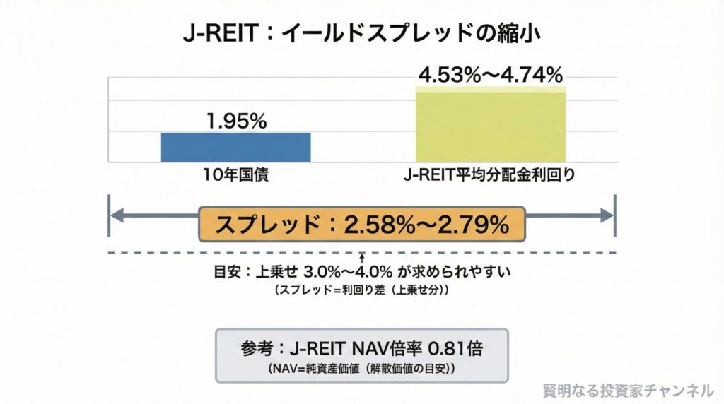 J-REITは金利上昇の直撃を受けやすいセクターです。J-REIT平均分配金利回りが約4.53〜4.74%に対して、10年国債が約1.95%だと、スプレッドは約2.58〜2.79%にとどまる、という整理です。