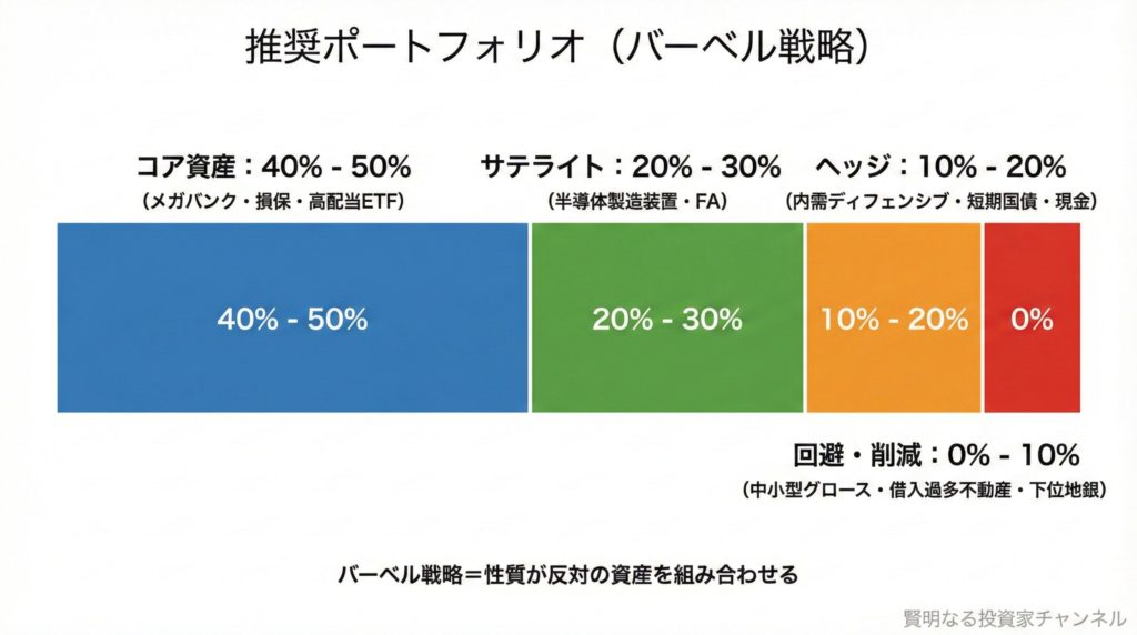 • 回避・削減(0〜10%):中小型グロース、借入過多の不動産、下位地銀