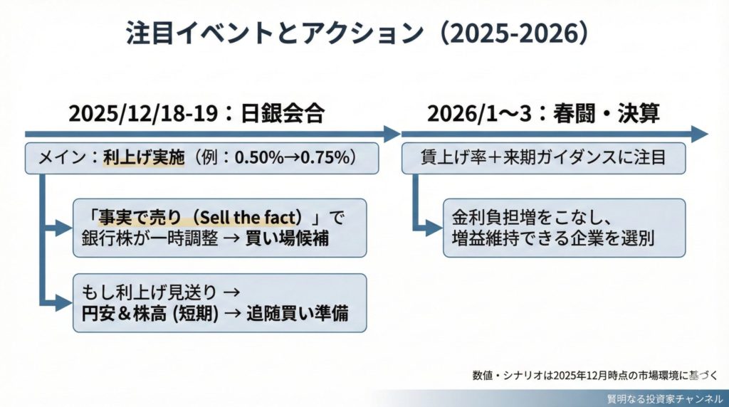 日銀会合で利上げが実施されるケースはメインシナリオとして例示されており(例:0.50%→0.75%)、材料出尽くしで銀行株が一時的に調整する「事実で売り(Sell the fact)」が出た場合、買い場になり得るという整理があります。