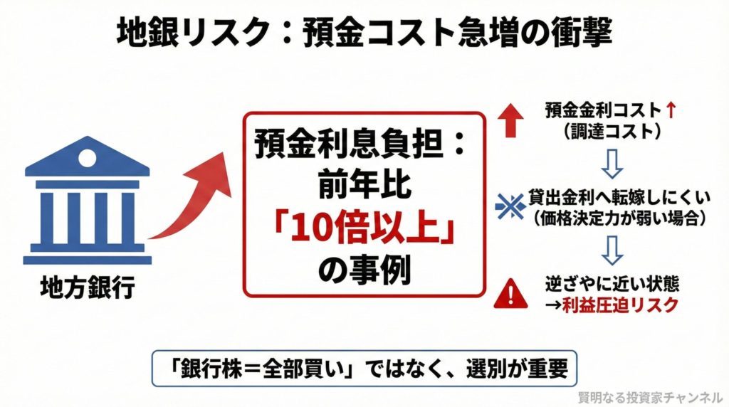 一部の地域銀行では、預金利息負担が前年比で10倍以上に拡大した事例がある、という整理です。