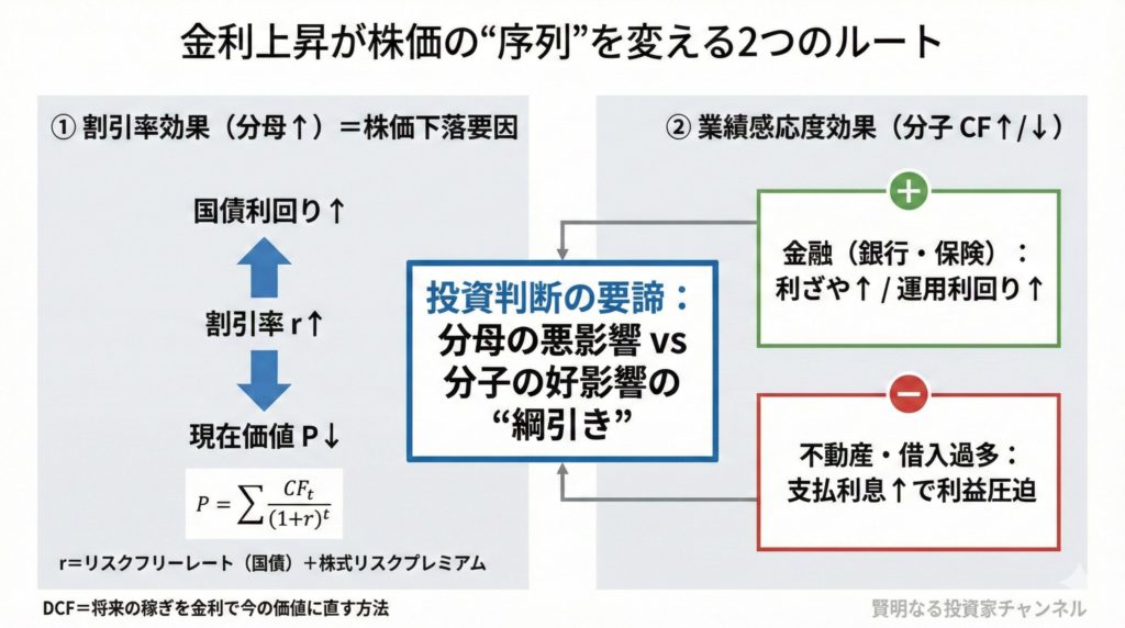 • 割引率効果(分母の拡大):将来の利益を“今の価値”に引き直すときの割引率(ざっくり言うと「金利を含むハードル」)が上がると、理論上の株価は下がりやすくなります。特に、利益が遠い将来に偏る銘柄ほど影響が大きいです(デュレーション=値動きが金利に敏感になりやすい性質)。