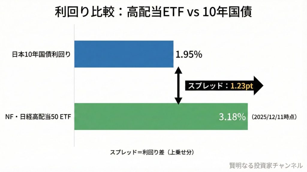 一方で、高配当の代表例として、NF・日経高配当50 ETFの分配金利回りが3.18%(2025年12月11日時点)という数字が示されています。