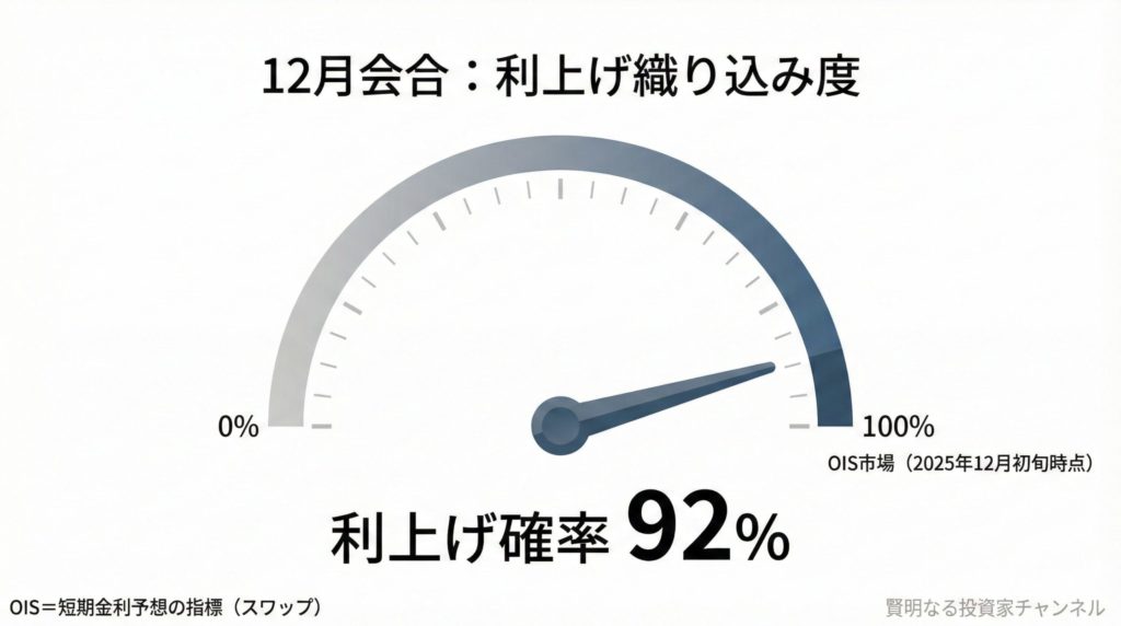 2025年12月18日・19日の日銀金融政策決定会合を前に、市場は追加利上げを強く織り込みつつあります。OIS(オーバーナイト・インデックス・スワップ:短期金利予想を反映しやすい金利スワップ指標)では、12月会合での利上げ確率が約92%という水準まで上がっています。