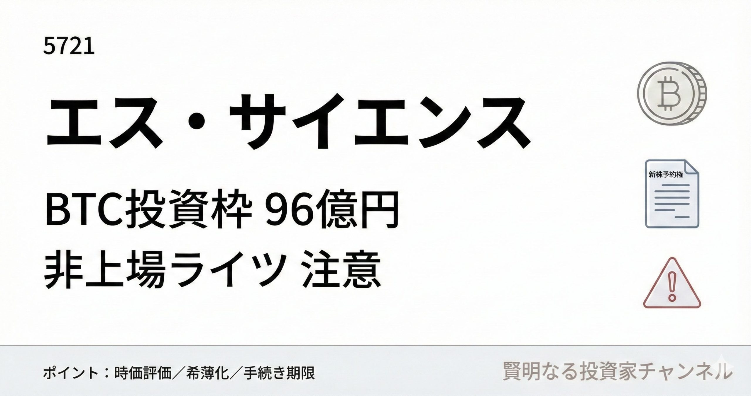 エス・サイエンス(5721)は、暗号資産(ビットコイン)を軸にした財務戦略と、大型の資金調達スキームを同時に進めています。短期で値動きが大きくなりやすい一方、仕組みを誤解すると不利になりやすい論点も多い局面です。