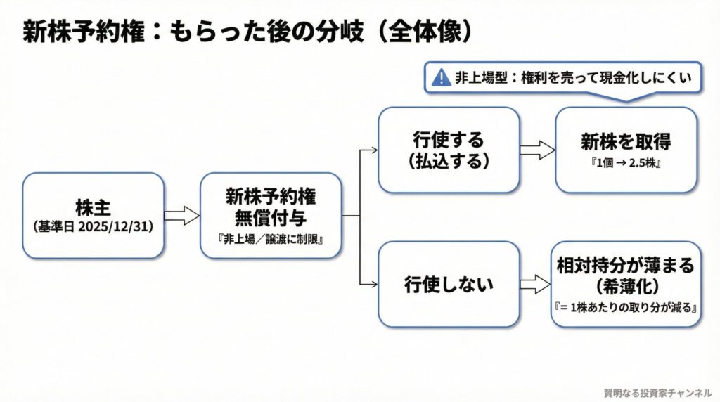 - 全株主向けに新株予約権(無償)を割り当て。ただし非上場型で“売って現金化”が難しい