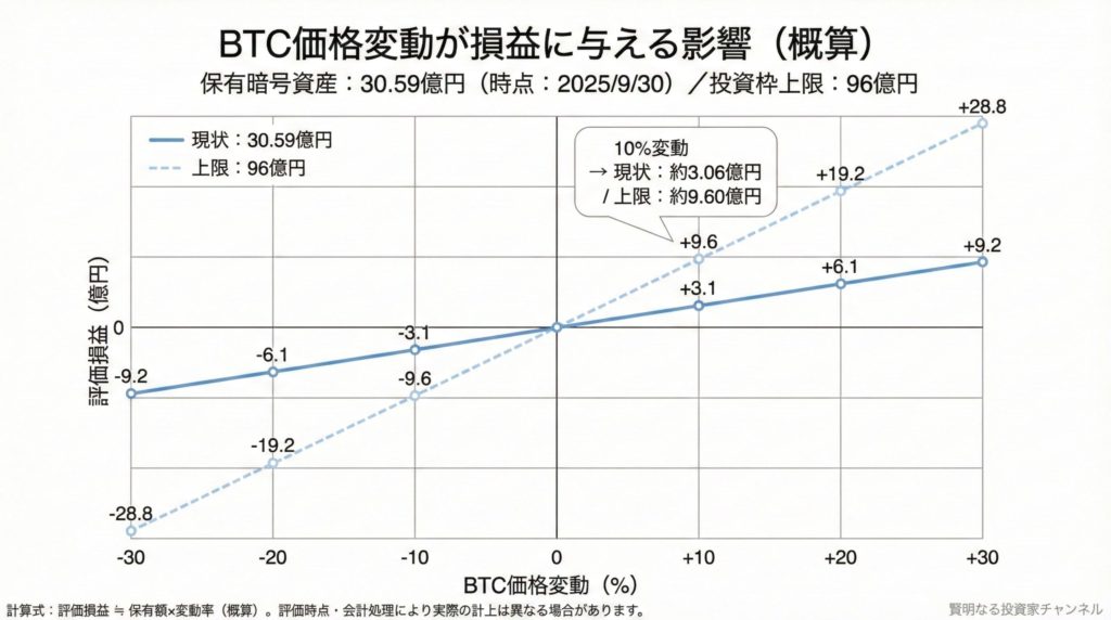 投資枠の上限(96億円)まで投資した場合、BTC価格が10%動くと評価損益は概算で約9.6億円(≒10億円)になり得ます。これは事業の好不調とは別に、決算数字が振れやすい構造を意味します。