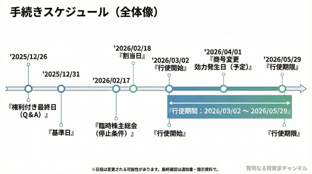 日程は適時開示・Q&A時点の情報で、手続き上の事情などで変更される可能性があります。最終的には会社の通知書や目論見書で確認してください。