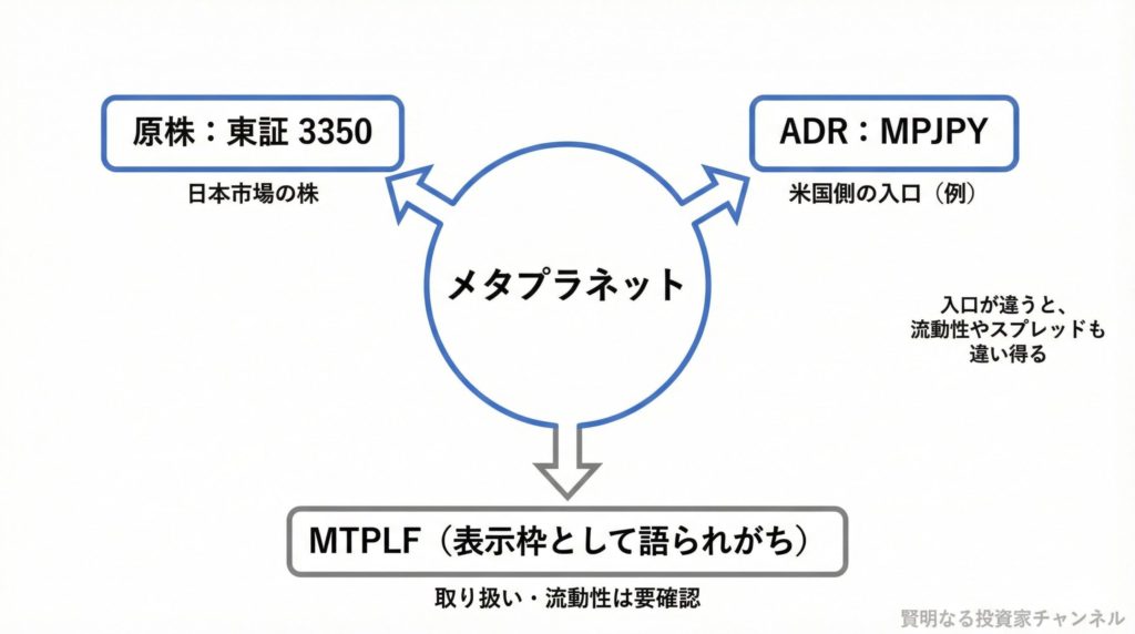 • MTPLF:過去から存在する表示枠として語られることがあるティッカー。制度・契約関係が同一とは限らず、取扱い(流動性や手続き)が投資家の利用する証券会社側の仕様に左右される可能性があります。