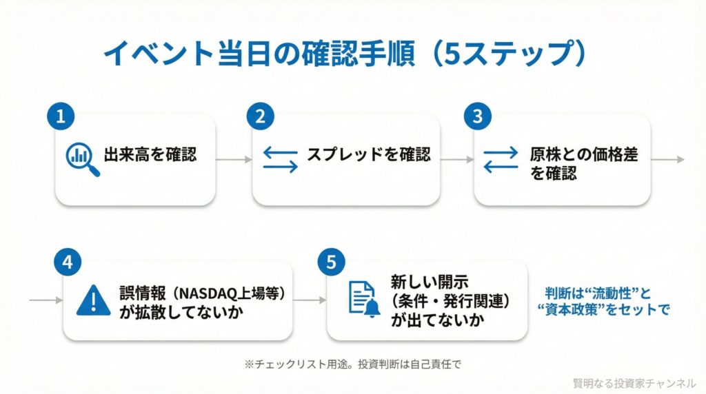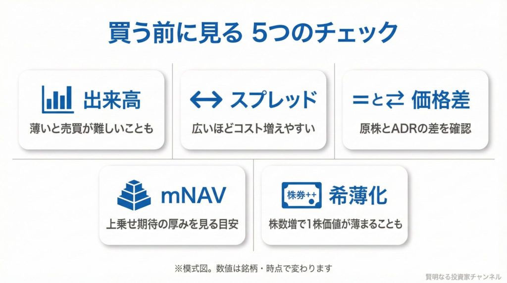 むしろ個人投資家が注目すべきは、OTCの流動性(出来高・スプレッド)と、資本戦略の設計(希薄化の出方)です。ビットコイン相場だけでなく、株式としての需給構造まで含めて見た方が、判断の精度が上がります。