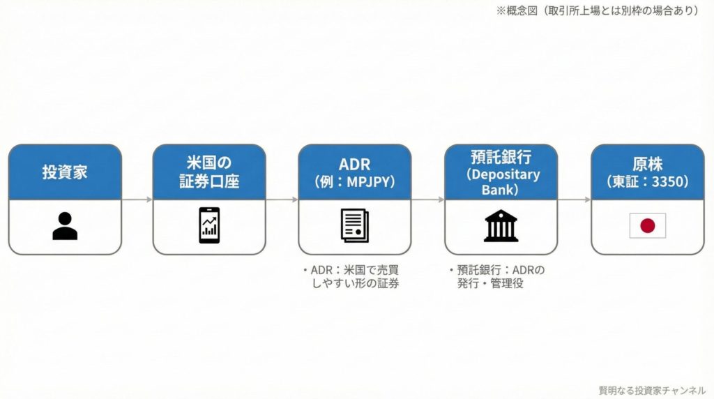ADR(米国預託証券)は、海外株(ここでは日本株)を「米国で売買しやすい形」にした証券です。発行・管理を担うのが預託銀行(Depositary Bank)で、投資家は米国市場の導線で売買しやすくなります。