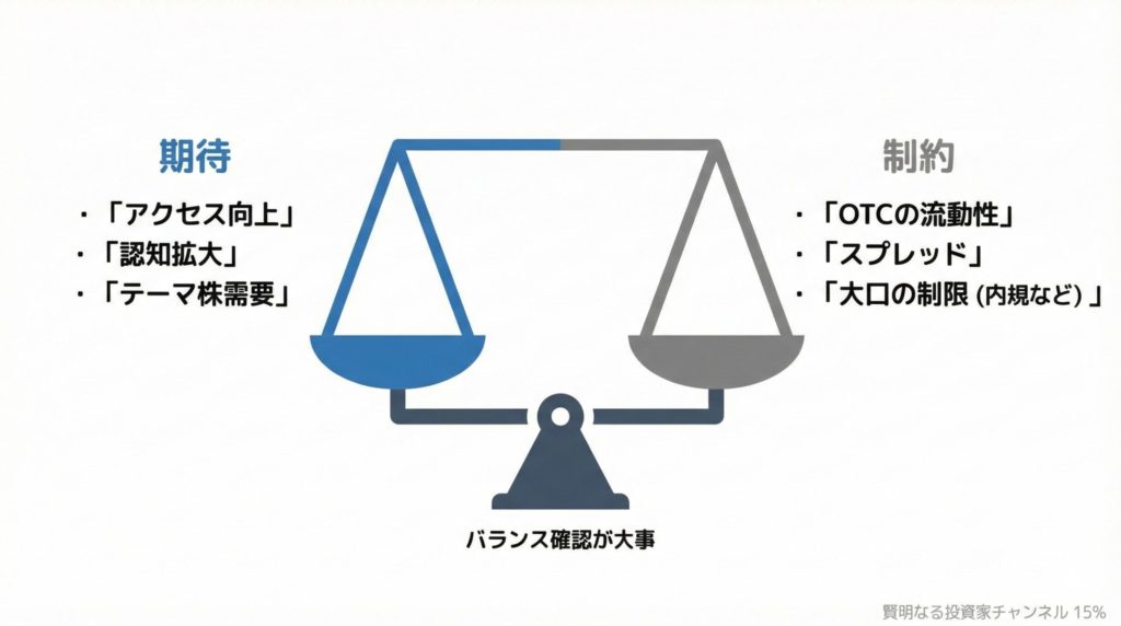• OTCは大手機関が買いにくい場合がある(内規でOTC銘柄を制限する運用もあります)。