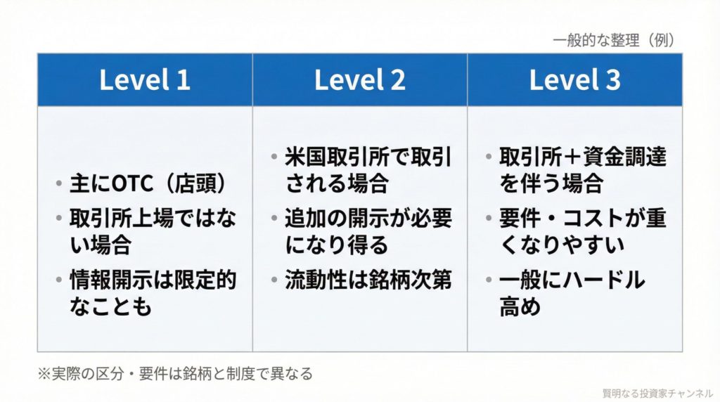 • Level 1:一般にOTC(店頭市場)で取引される枠。NASDAQ/NYSEのような取引所上場とは別物です。