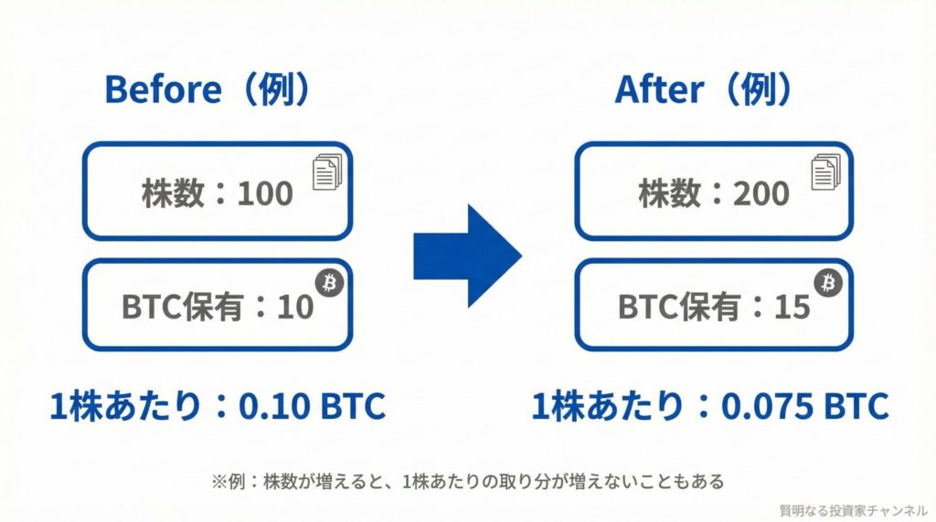 メタプラネットは、ビットコインの保有を増やすための資金調達手段として、普通株だけでなく資本性証券(優先株など)を組み合わせる方針が語られています。ここで重要なのが希薄化(発行株式数が増えて1株の価値が薄まること)の扱いです。