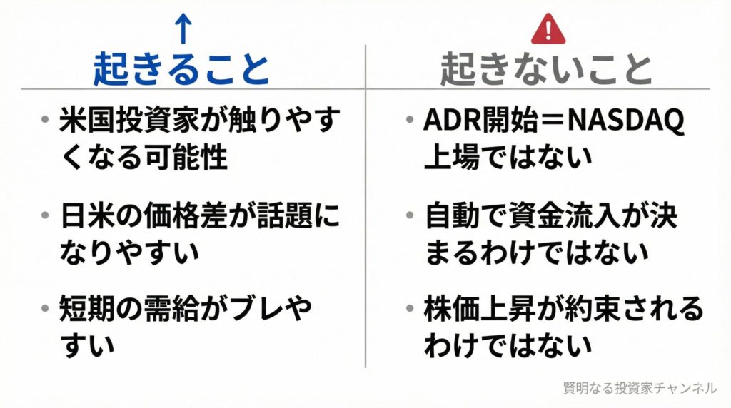 ADR開始は、米国側の売買導線を増やす意味で注目されやすい一方、取引所上場とは別枠で、短期的に“確実な資金流入”を前提にするのは危険です。