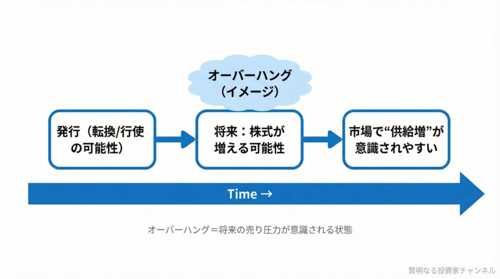 将来の転換・行使が意識されると、「上がったら戻り売り」が出やすくなります。テーマ株の強さがあっても、上値が重い局面が続くことがあります。