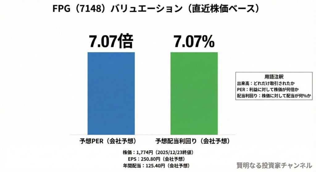 また、株価が1,774円(2025/12/23終値)の水準で、会社予想EPS 250.80円・会社予想年間配当125.40円を前提にすると、予想PERは約7.1倍、予想配当利回りは約7.1%という見え方になります。