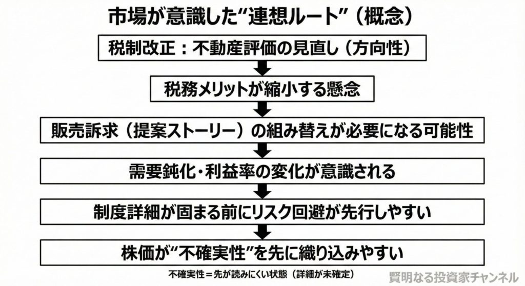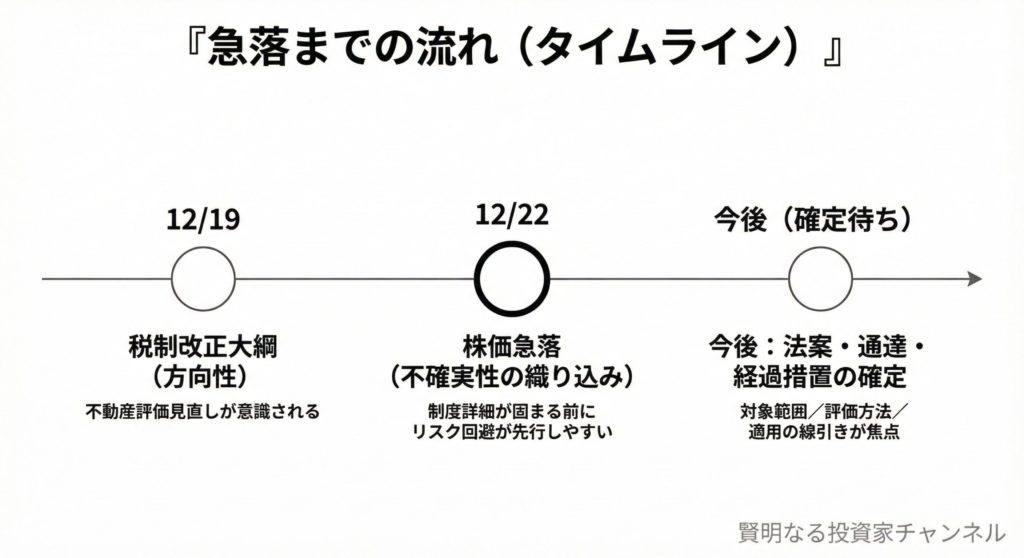 • 株価急落の中心は、資産課税(相続・贈与)の不動産評価見直しという「不確実性の高い材料」です。