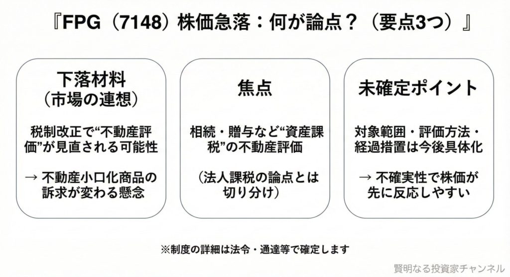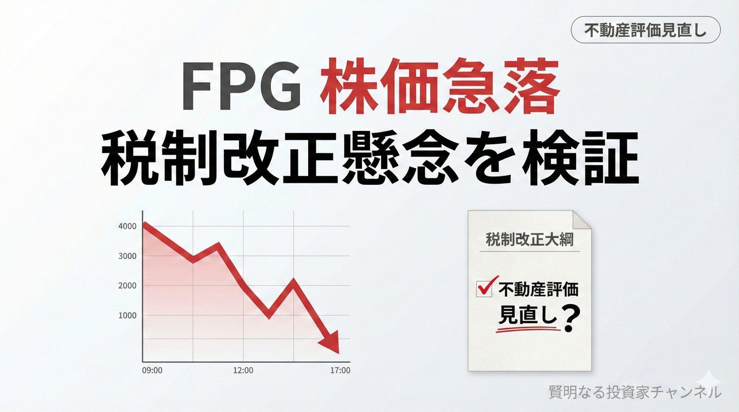 2025年12月、FPG(7148)の株価が急落し、市況ではストップ安水準まで売り込まれたと報じられました。決算悪化ではなく、「令和8年度(2026年度)税制改正大綱」で示された資産課税(相続・贈与)における不動産評価見直しが、同社の不動産小口化商品に逆風になり得る――という連想が広がったことが背景です。