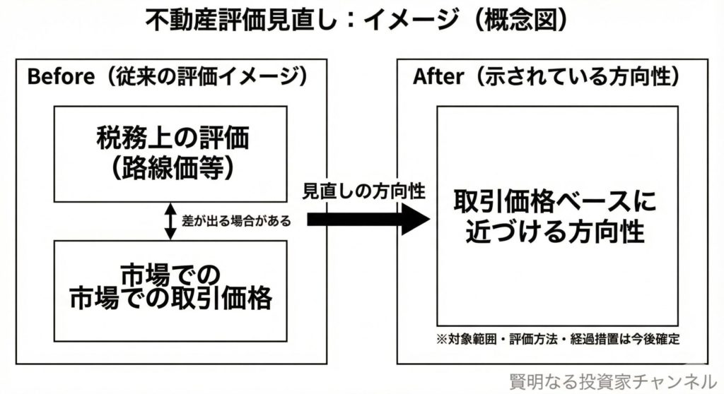 今回の焦点は、相続・贈与で用いられる不動産の評価(相続税評価)です。従来は、路線価や固定資産税評価額などで評価されることがあり、実際の取引価格(市場価格)と差が出る場合があります。この差が税務上のメリットとして意識されることがありました。