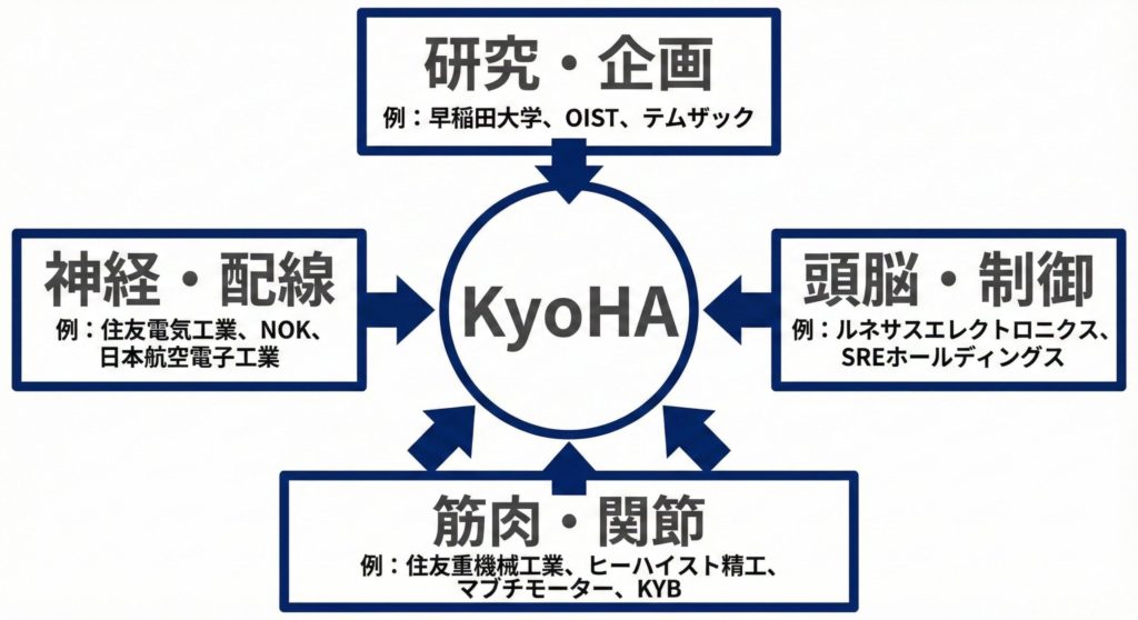 こうした状況のなかで、要素技術を持つ企業が単独で完結させるのではなく、「部品・センサー・制御・アクチュエータ」を分担する形で、オールジャパンの連合体制が組まれたと考えられます。