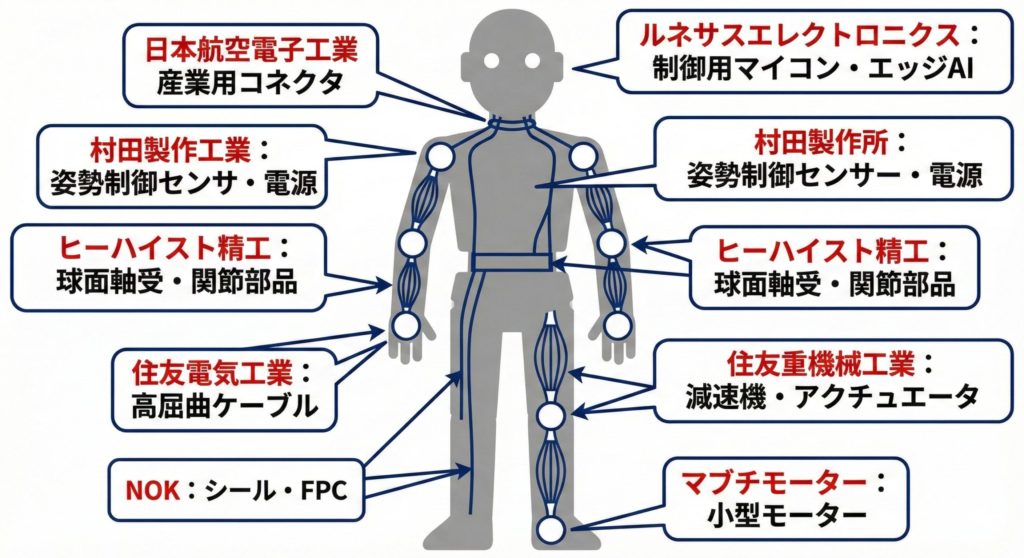 ヒト型ロボットは、人間に近い自由度を実現するために多数の関節とセンサーを必要とします。その「五体(骨格・関節・筋肉)」と「脳神経(制御・センサー)」を、上記のような日本の部品メーカーが分担する構図になっていると見ることができます。