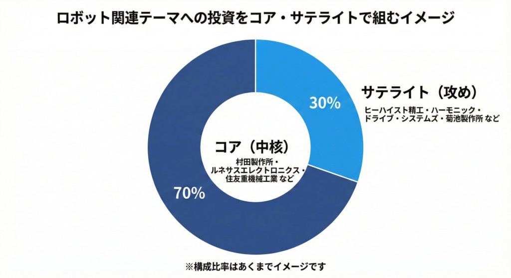 本テーマにどうポートフォリオを組み入れるかについて、一例として「コア・サテライト」で整理しておきます(あくまで考え方の例です)。