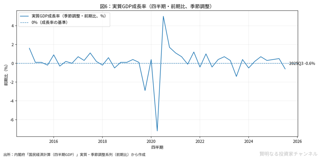 利上げ判断を難しくしているのが、景気の弱さです。2025年7-9月期の実質GDPが弱い数字だったことは、利上げを急ぎにくい材料になります。