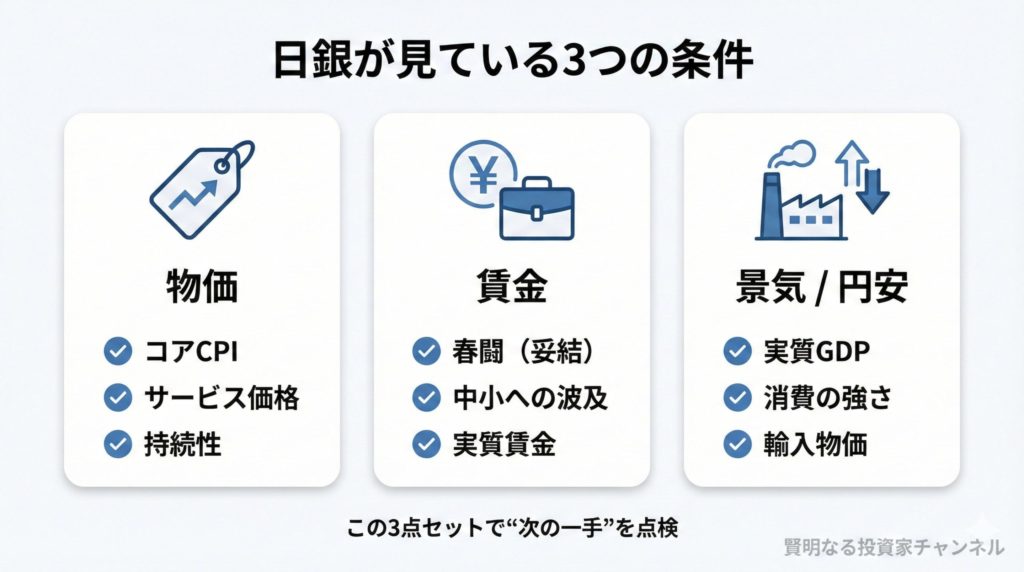結論を急ぐより、日銀が繰り返し強調している“判断軸”を3つに分解して点検すると、見通しが整理しやすくなります。本記事では、①物価の持続性、②賃金(春闘)の確度、③景気と円安の副作用の3点から、1月・3月・4月を比較します。