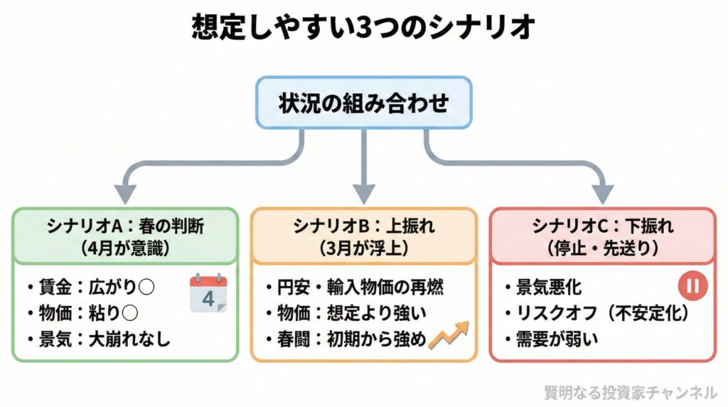 円安・輸入物価の再燃が強く、物価が想定より落ちず、春闘も早期から強い結果が見えた場合は、3月が意識される余地が出ます。ただし、サプライズになりやすい点には注意が必要です。