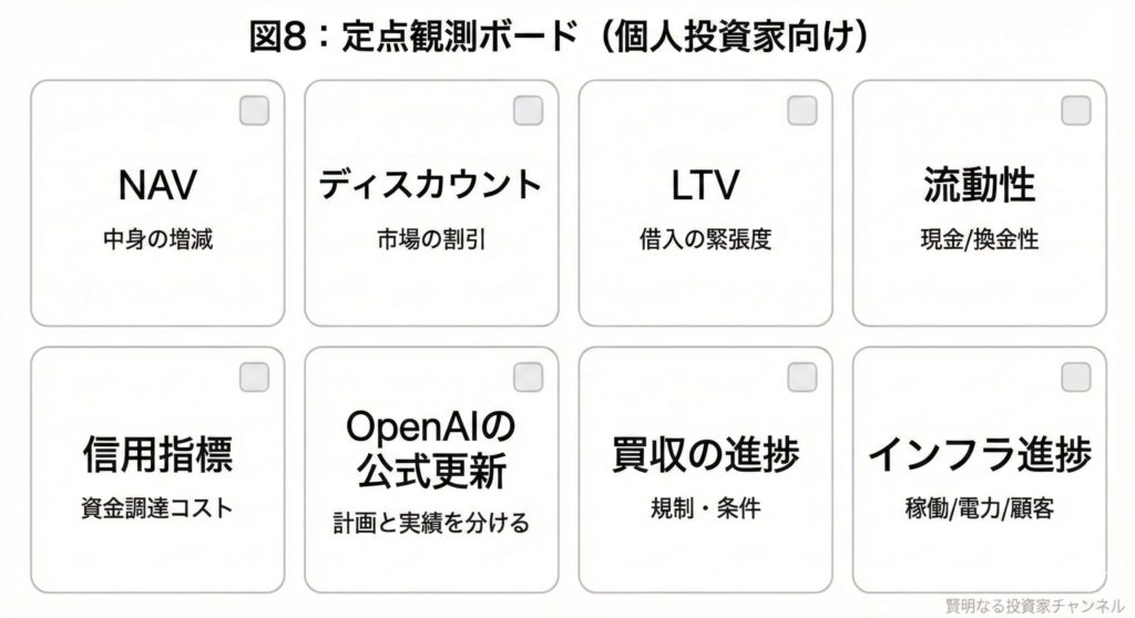 大切なのは、ニュースの見出しだけで判断せず、NAV・ディスカウント・LTVという軸で「どのシナリオに近づいているか」を定点観測することです。