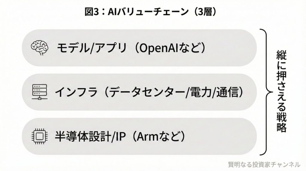 この2本は単なる話題作りではなく、「AIの中身(モデル)×土台(インフラ)×半導体設計(Arm)」をまとめて押さえに行く、かなり尖った戦略に見えます。うまく回ればリターンは大きい一方、外したときの傷も深くなりやすい構造です。
