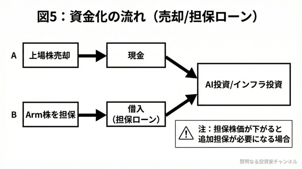 - Arm株を担保にした資金調達(マージンローン:担保株価が下がると追加担保を求められ得る)