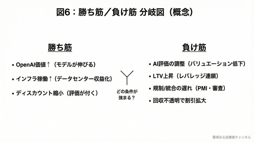 SBGのAI戦略は、モデル(OpenAI)と土台(インフラ)を同時に取りに行く「一発が大きい」構図です。成功すればNAVの増加とディスカウント縮小が同時に起きる可能性がありますが、反対にAI評価の調整や規制遅延、レバレッジ連鎖が重なると下方向も増幅しやすくなります。