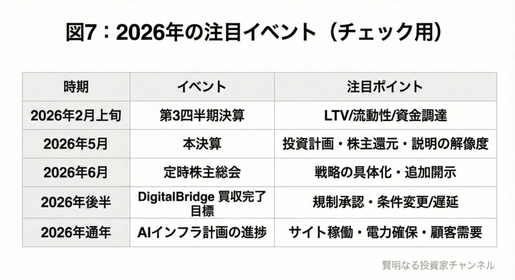 | 2026年後半 | DigitalBridge買収の完了目標 | 規制承認の見通し、条件変更や遅延の有無 |