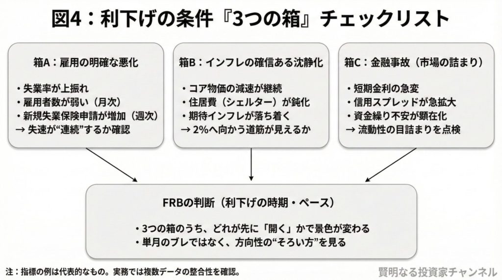 利下げは「そのうち来る」ではなく、何が起きたら来るのかを条件で見た方がブレにくいです。ここでは3つのトリガー(箱)に分けます。