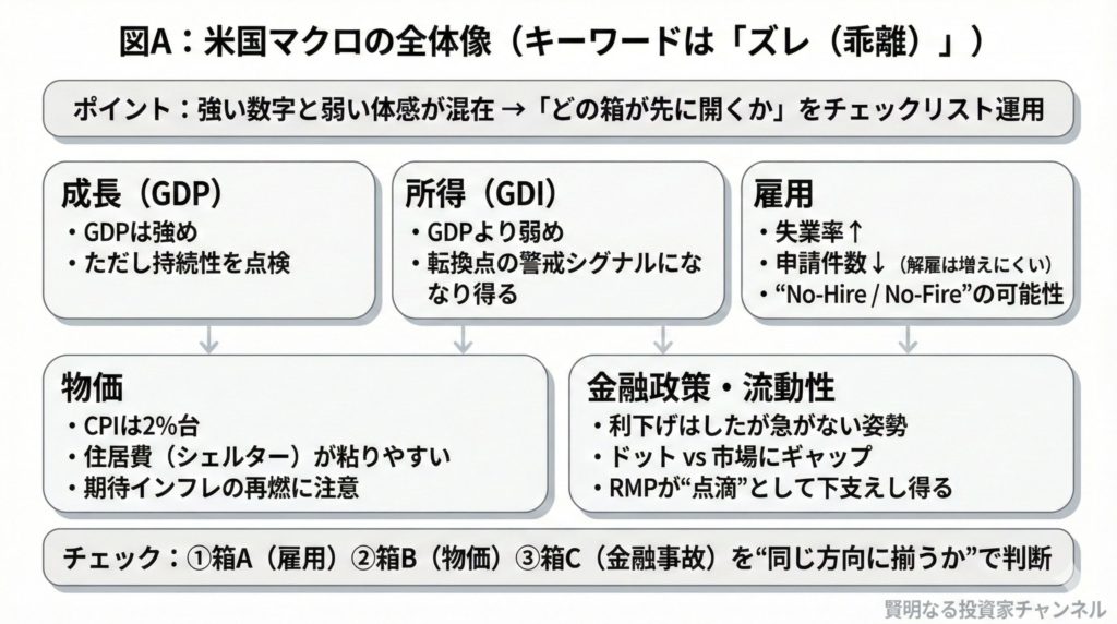 いまの米国をひと言でいうと、「体(GDP)は動いているのに、気分(センチメント)は冷え、雇用はちぐはぐ」です。主要指標を一度、同じ画面に並べて整理します。
