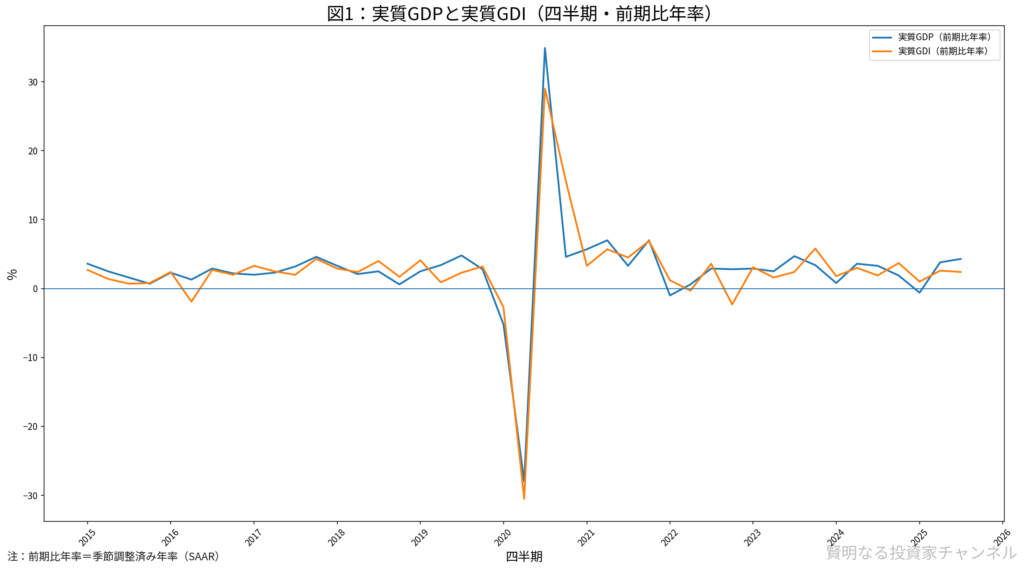 2025年Q3の実質GDPは年率+4.3%と強い一方、実質GDIは+2.4%にとどまっています。GDP(生産)とGDI(所得)がズレる局面は、後からGDPが下方修正されたり、景気の曲がり角を示すことがあります。ここは「強い数字=安心」と決め打ちしない方が安全です。