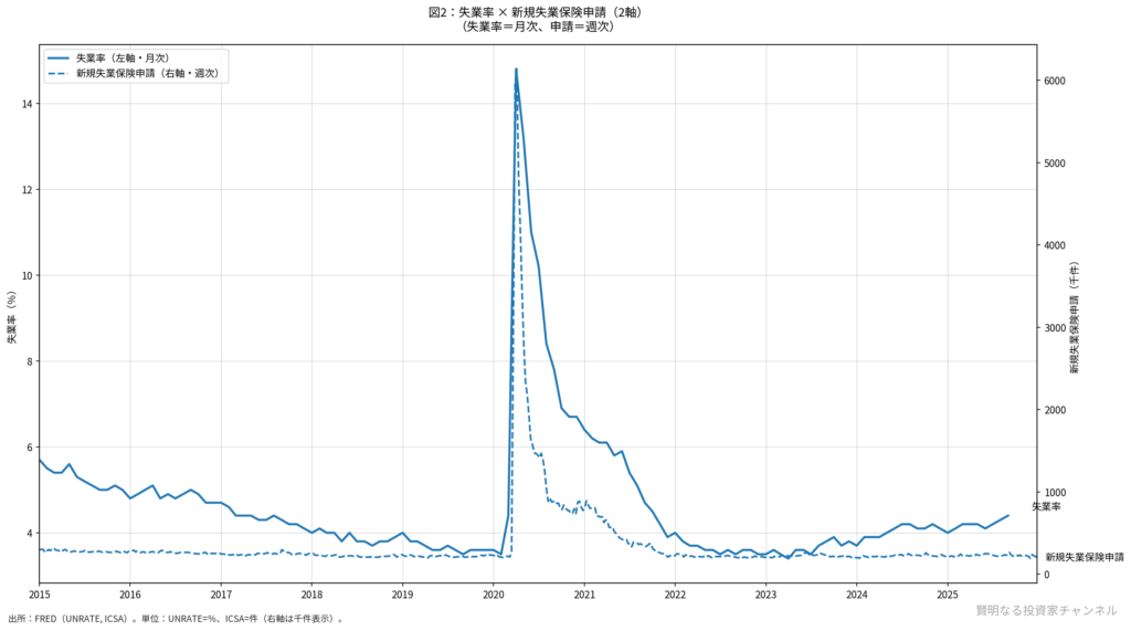 - 見る場所:雇用統計(失業率・雇用者数)+週次の失業保険申請
